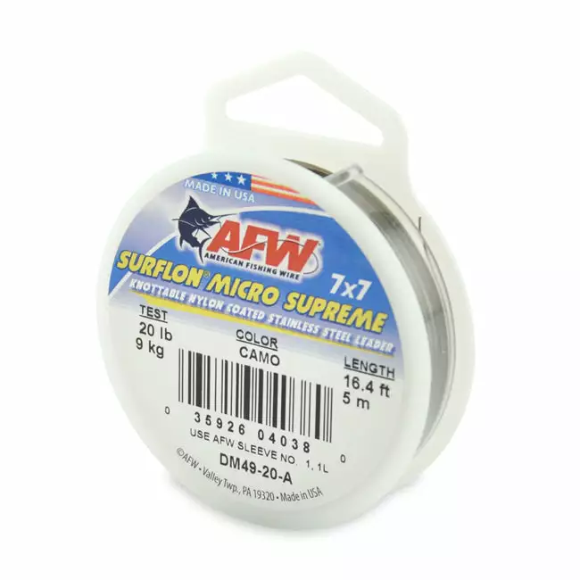 Perhaps the best leader wire available! Surflon Micro Supreme is miniature 49 strand stainless steel wire that is extremely flexible and kink resistant. This wire is ideal for many types of sport fishing because it can be knotted to your bait and line like monofilament, it provides greater flexibility and less stretch than monofilament, and is generally smaller diameter per pound test, and therefore, less visible in the water. Surflon Micro Supreme is extra limp and has virtually no memory or stretch. The wire enhances the action of live and artificial baits and adds a level of realism never before attainable using wire or other leader materials such as monofilament and fluorocarbon.
