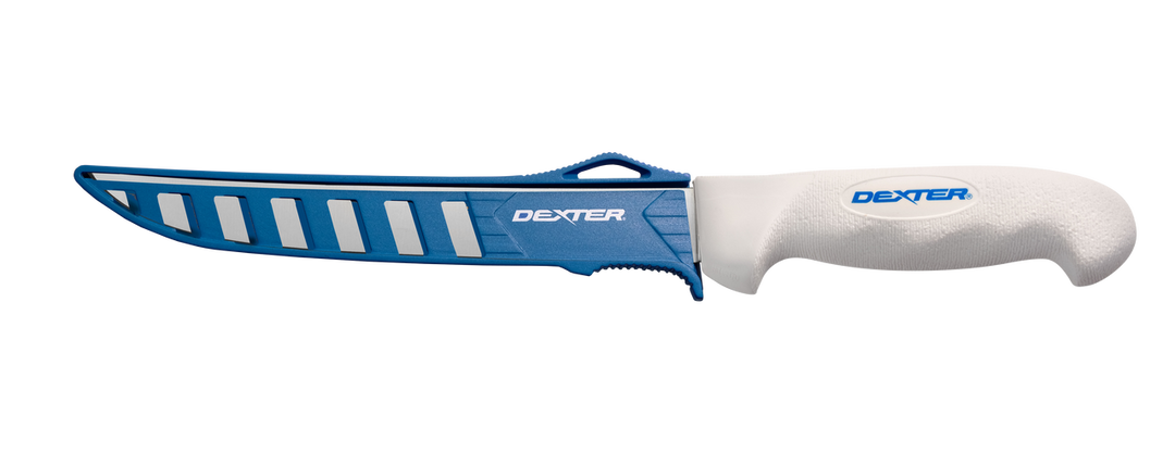 The Dexter EG8W Edge Guard protects the edge of your knife when not in use. It provides a snug fit to the blade so it won’t fall off. This Edge Guard fits straignt blades 8″ wide fillet knifes and our tiger edge scalloped utility knife.