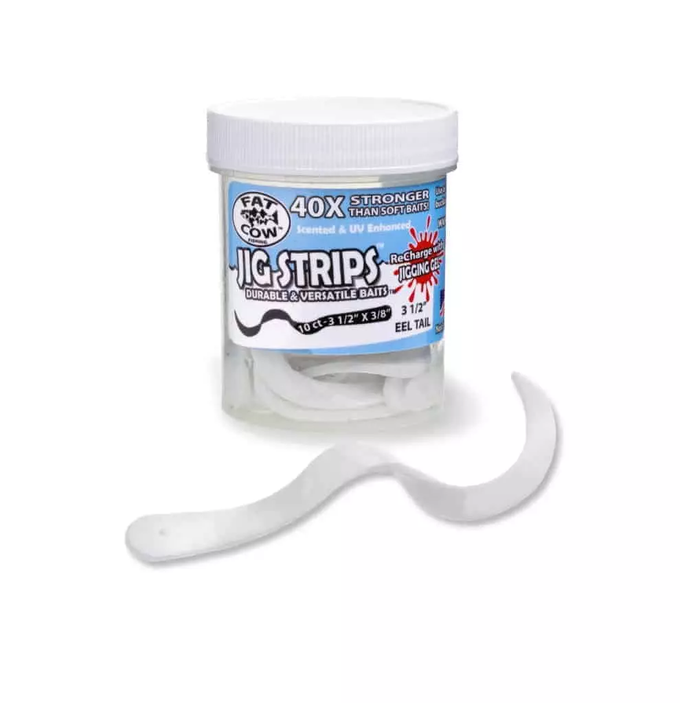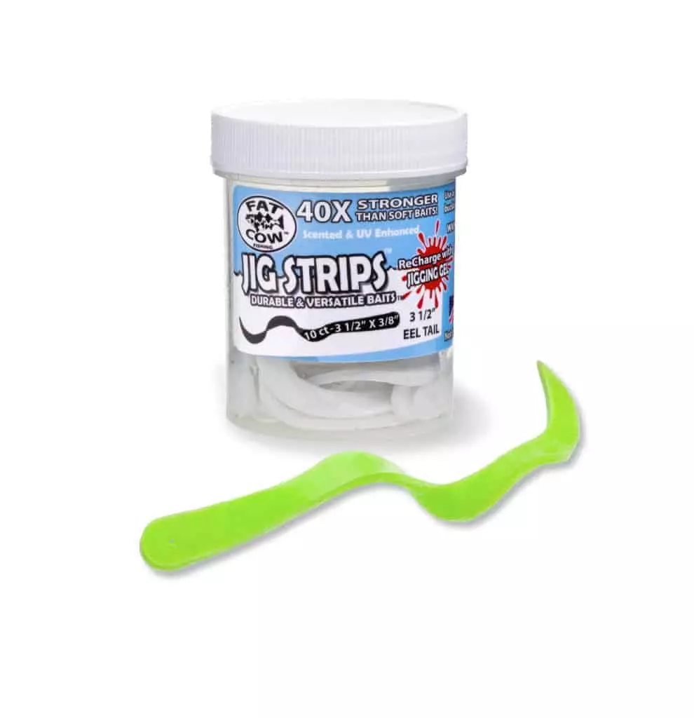 Jig Strips are durable and versatile baits developed using a unique flexible synthetic material. These trailers add strike simulating action and scent while maintaining their usefulness. Leave Jig Strips on your hook and use it over and over again. Spend less time changing your lure trailers and more time hauling in the big one – try a jar today and fish on.