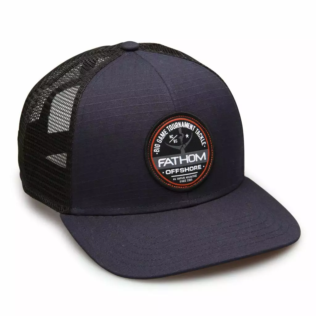 Rip stop mesh back trucker cap with Fathom Offshore tails up woven patch applique.