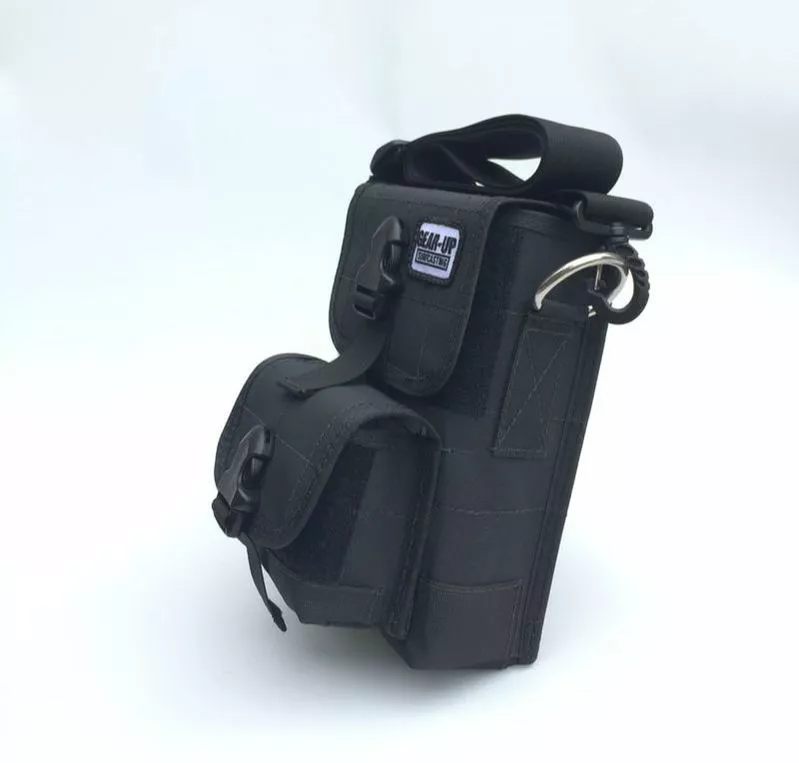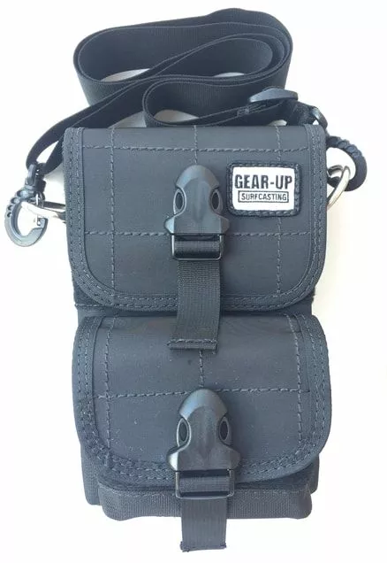 Gear-Up’s two tube with front pouch was made for surf casters who love to carry ‘all-in-one’ surf bag. It comes with a removable shoulder strap. Two plastic clips; one for the main flap of the bag and the other for the pouch. These clips will ensure surf casters who are wet suiting out to rocks once locked in, no plugs or tins will fall out of the surf bag. The front pouch has no bucktail or tins slots, it is completely empty inside. The front pouch can be used for bucktails, tins or soft plastics all depending on what the surf caster wants to throw in that given day. It has two brass nickle plated d-rings on each side of the bag where the removable strap is attached too. The back of the surf bag has two heavy-duty scuba webbing material belt loops. The bottom of the bag has plenty of grommets for fast drainage.