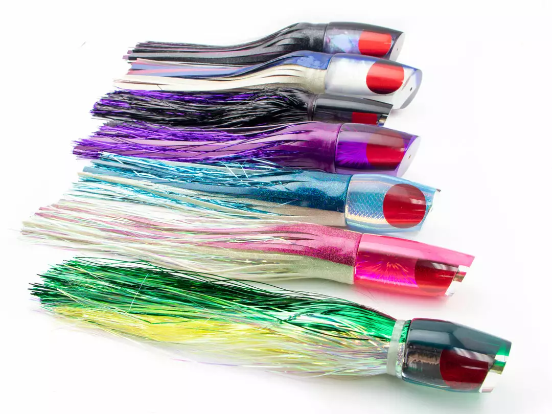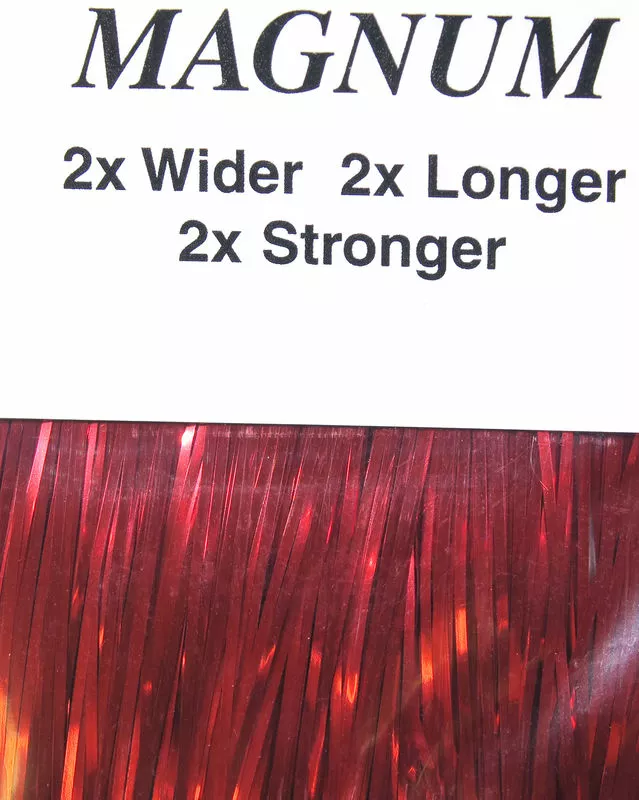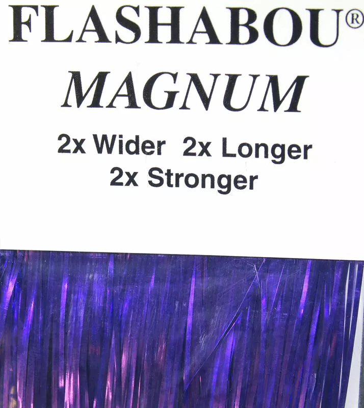 Magnum flashabou is just like regular flashabou, but in a wider and stronger cut. Twice as long, twice as wide! We really like this flashabou for custom skirting big game lures. Both marlin lures, and bullet style tuna lures look amazing when skirted with flashabou. These packages contain approximately 400 strands, 1/32″ wide by 20″ long.