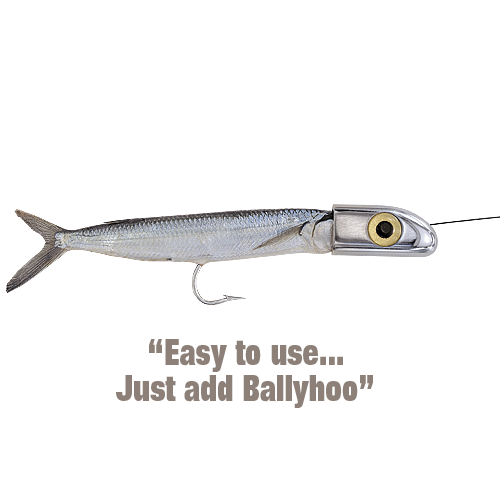Simply place over a small to medium-sized Ballyhoo and watch it swim below the waters’ surface. The Iland Hood® with chrome plating for long-distance flash, has been scientifically designed and weighted to allow fishermen to troll natural and artificial Ballyhoo at speeds up to 12 knots. Minimizes “washout” and makes rigging extremely easy. Ideal for Tuna, Wahoo, Dolphin, Sailfish, Marlin and King Mackerel.