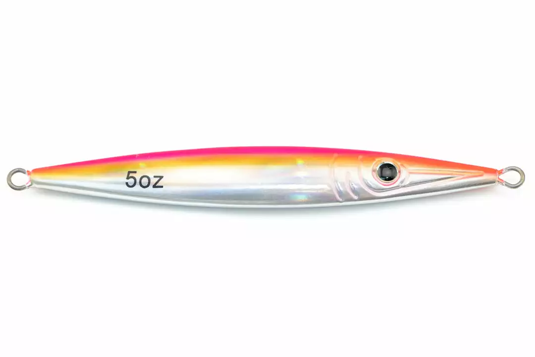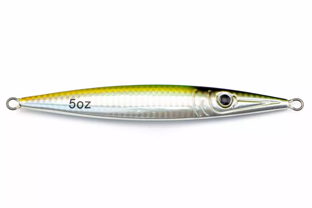 Previously under the name of the Sting-O brand, the original PBJ jig is back by popular demand! This is a thin profile jig that works very well when fish are feeding on sandeels and other slender baitfish. These work very well for tuna, striped bass, bluefish, trevally, sea bass, and many other species. We offer these either unrigged, or rigged with a single Owner Dancing Stinger assist hook.