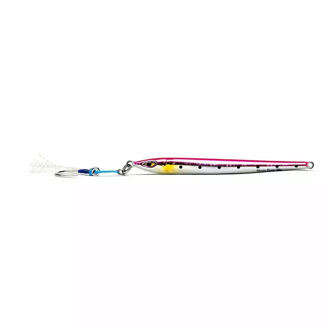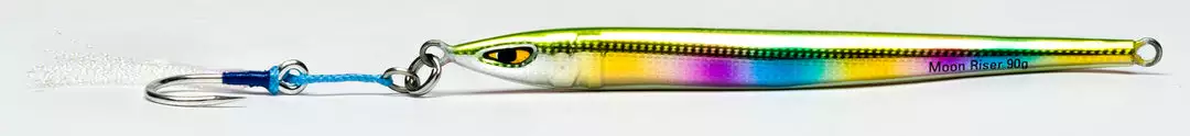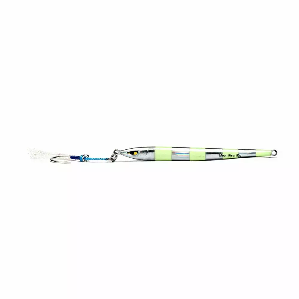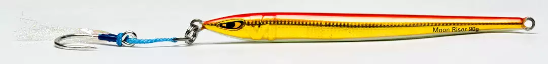 The Moon Riser jig is “streaker” style jig with it’s slim profile and weight concentration near its head. It is a highly versatile jig that attracts different species. Due to its streamline design, it descends quickly and is great for fishing spots that hold structures, such as wrecks. It cuts through water with minimal resistance and allows the angler to jig in deeper water. Slower and longer strokes are ideal for working the Moonriser and this less intense technique allows anglers to continuously jig for a longer duration, increasing the chance of a strike. We love these jigs for jigging tuna, in particular, bluefins that are keyed in on sandeels.