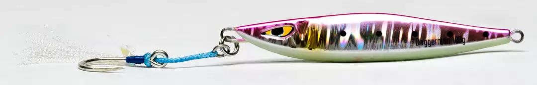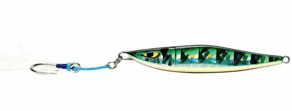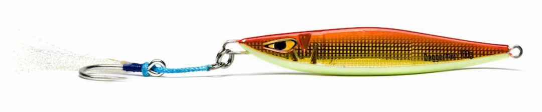 The Daggerman jig is a 60:40 front weighted vertical jig specially designed for aggressive predators like amberjacks, yellow tails and all species of tuna. The Daggerman is best presented in short rapid pumps with short pauses in between. The aerodynamically shaped Daggerman rips through the water column, drawing the attention of nearby predator and during the short pause, immediately dips head down, resembling the natural movement of a struggling baitfish. Most hits are usually encountered right after the pause.