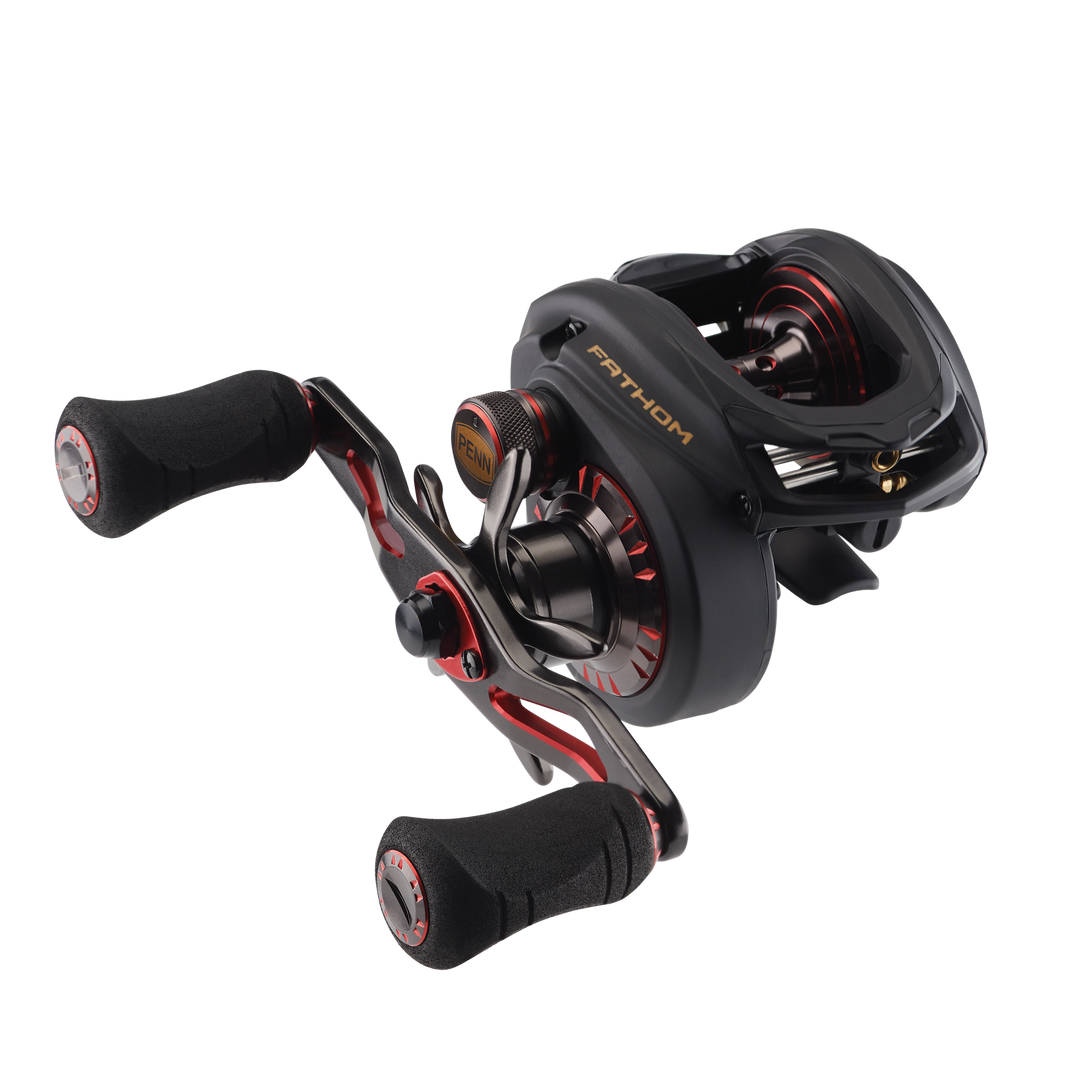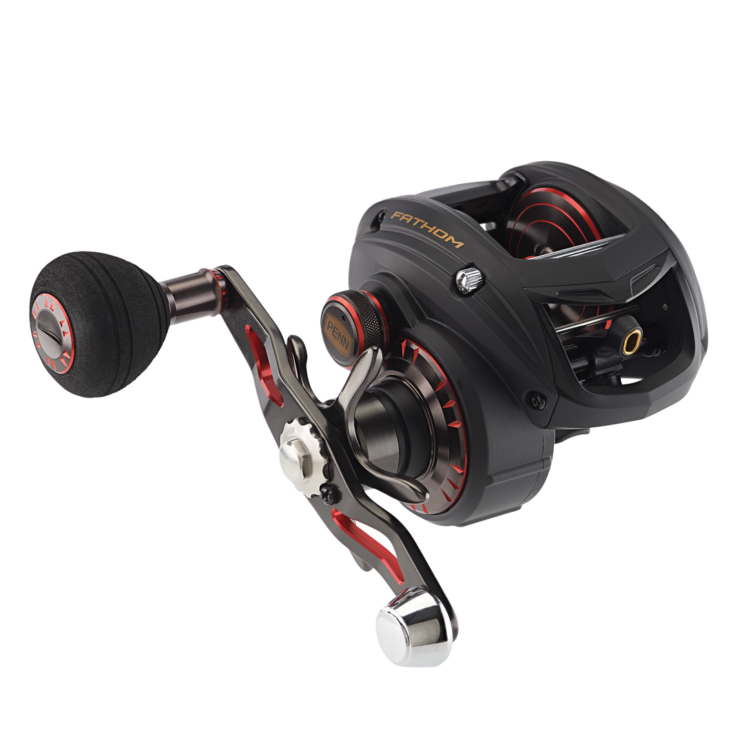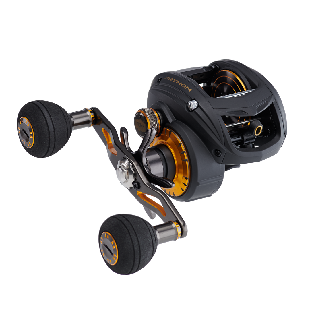 The PENN® Fathom low profile baitcast reels offer all the features you need to tackle the toughest saltwater fish. The Full Metal Body and Right Side plate, matched with a brass main gear and bearing supported pinion offer a drivetrain with unparalleled power, while the TiN Coated Level Wind System and Synchronized Drag and Level Wind system (*400 size only) give extra durability under high drags. Available in 200, 300 and 400 sizes with both standard and high speed gear ratios. Left hand models available in standard gear ratio only.