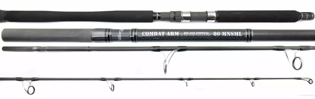 The Centaur Combat Arm “BIG ONE” 80SML Popping Rod is an excellent rod for Tunas, and Giant Trevally. This rod pairs well with a 14000 size reel, and it is a perfect model for bluefin tuna in the Northeast. These rods feature Toray Carbon blank construction, which makes them extremely light in weight, without sacrificing strength for popping and fish fighting power. This rod is easy to travel with as well. It is a 2 piece, with a joint at the end of the foregrip.