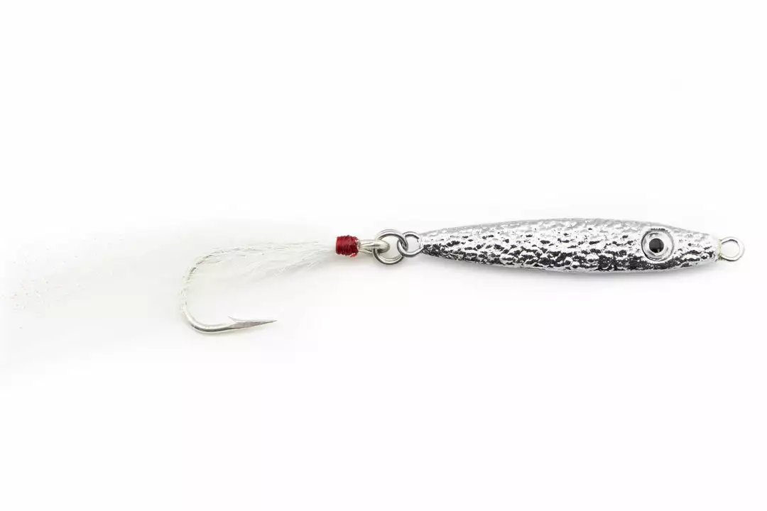 Proudly made in the USA by Run Off Lures. This jig has a slim profile, and it really shines as a casting lure. Striped bass, bluefish, and albies will all fall for these tins, but they also work great for vertical jigging sea bass in relatively shallow water.