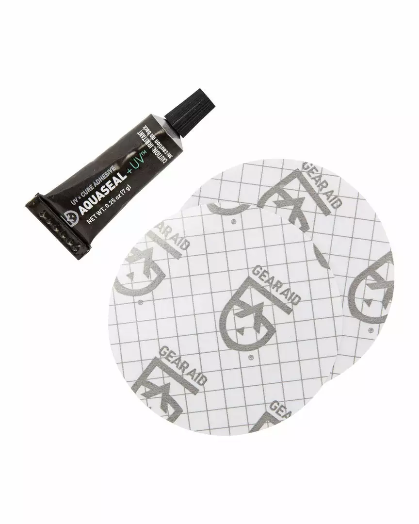 Quick-curing AQUASEAL® UV and Tenacious Tape patches for instant on-the-water repairs to waders and raingear.