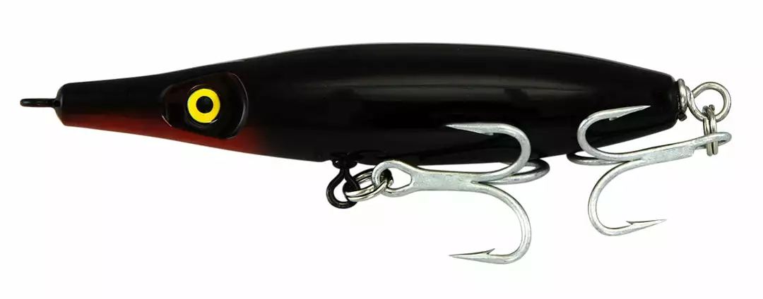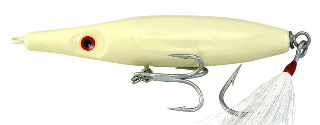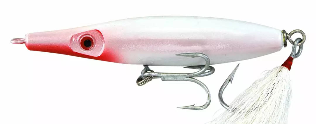 This stubby needlefish lure is great for casting long distances into the wind when trying to match the profiles of baits like peanut bunker or finger mullet. Effective on many species from Bluefish of the Northeast to Peacock Bass in South America. Some folks like to fish these with a single feathered hook on the rear instead of a treble.
