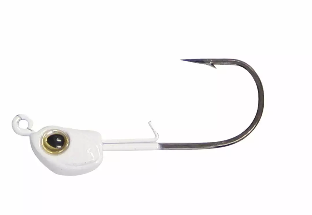The ultimate inshore head for rigging shrimp, jerkbaits, and a variety of other soft plastics. Available in red and white with high profile 3-D eyes. The dual wire keeper is quick to rig, holds bait firmly, and will not tear baits like single wire keepers. Available in the most popular sizes and features include short shank, wide gap, black chrome finish and Super Needle Points.