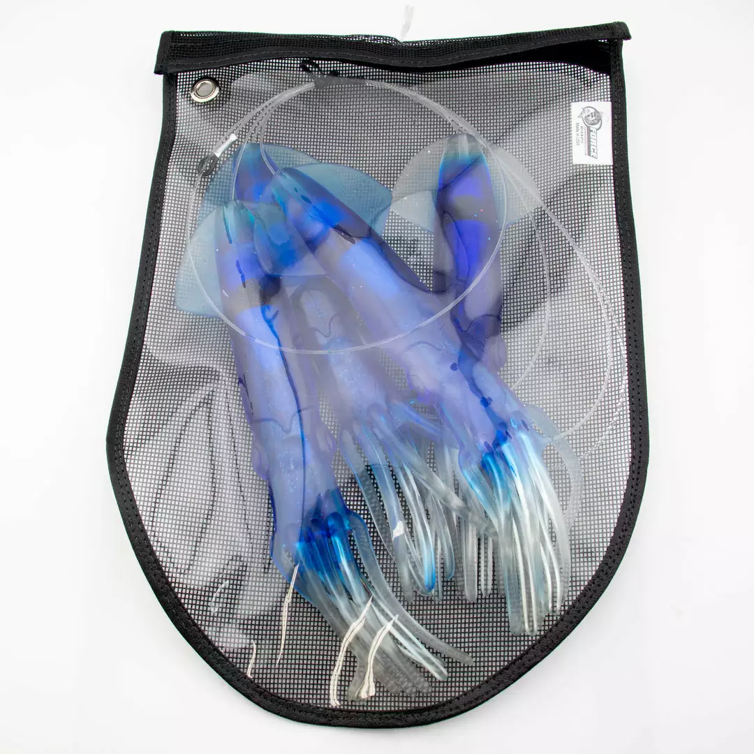 The “Squid Hound Billfish Special” teaser chain is rigged with four SquidNation Mauler 12″ squids. You can run this teaser chain off the rigger with a teaser chase-bait behind it.