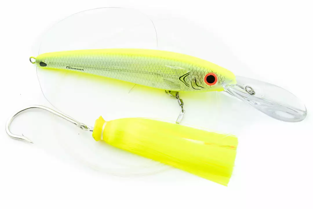 Nobody surpasses the quality of our offshore rigging. The “Bally Bomber” was designed by us here at White Water Outfitters. This rig is designed to get your ballyhoo down deep in the spread. This rig features a hookless Bomber CD30 diving plug, rigged to a color -coordinated 3 oz. Joe Shute trailing behind it with our choice of either a pin rig, or wire rig. When you want a get a little more depth out of your ballyhoo, but don’t want to fish a planer, this is an excellent choice.
