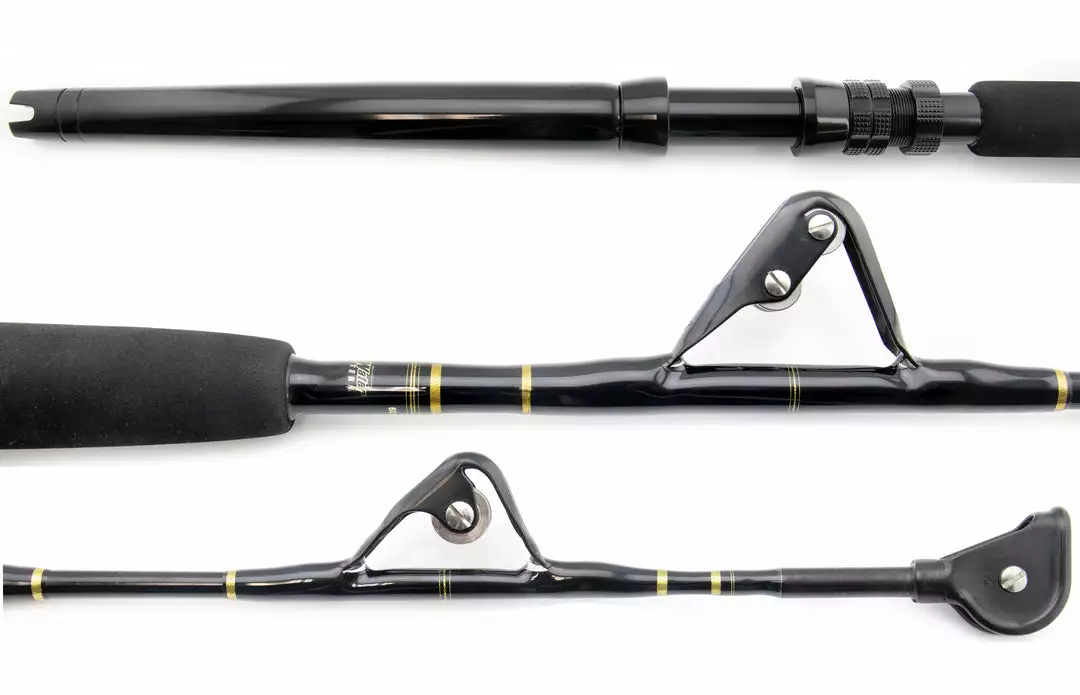 This is the rod that we’ve found to be the best for both stand-up trolling and chunking applications for tuna, shark, and marlin. We build these rods in three different line classes. 30 – 50lb., 50 – 80lb., and 60 – 100lb. We build these rods on Calstar blanks, with ALPS aluminum #2 butts (straight or curved), and Aftco Wind-On guides. The best all around choice for all offshore, big game applications.