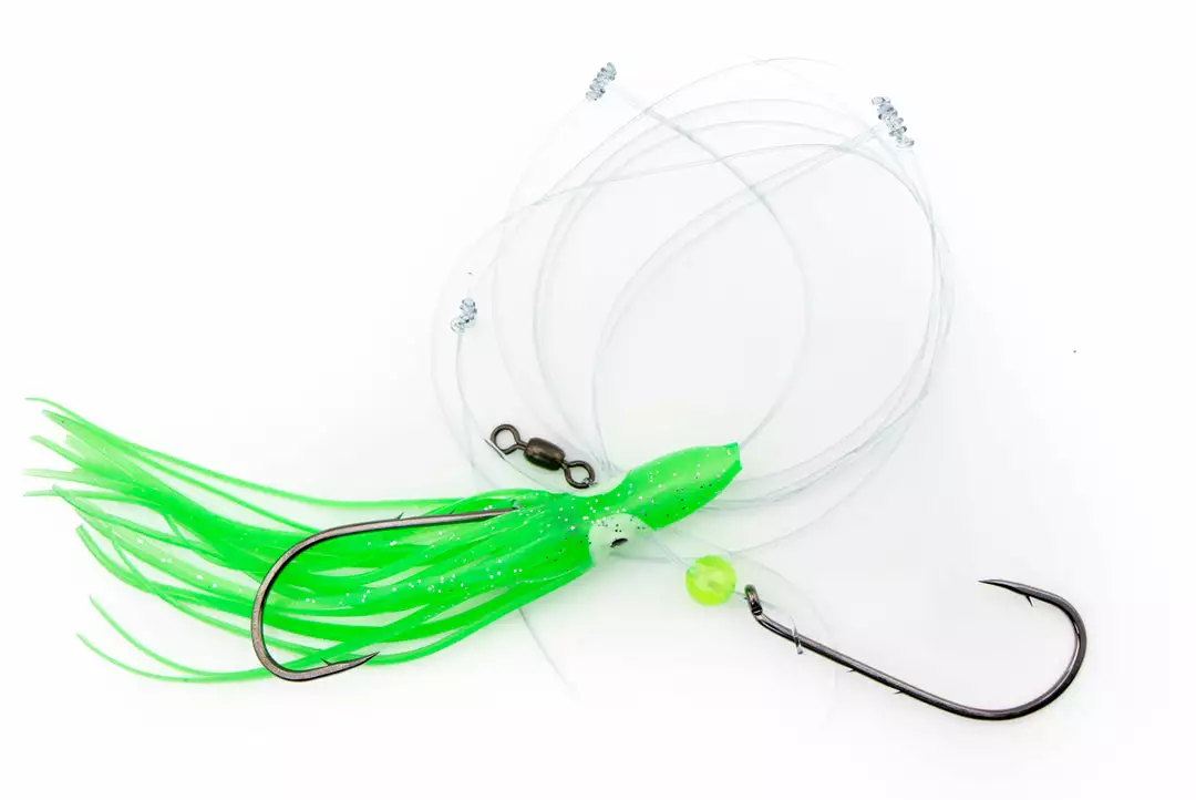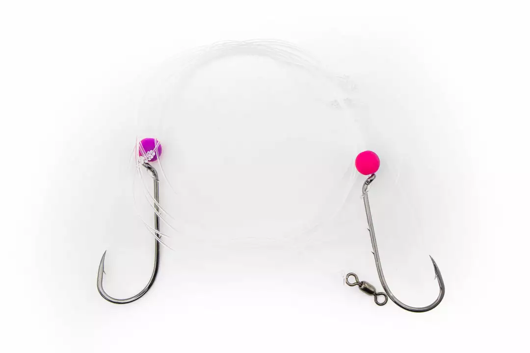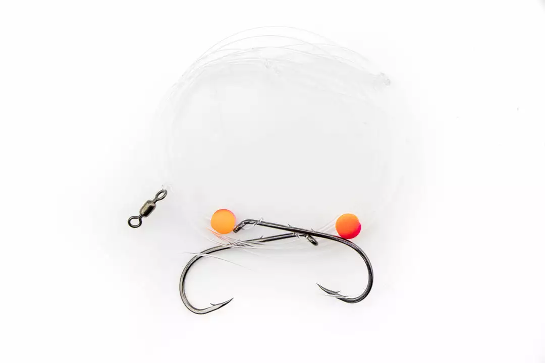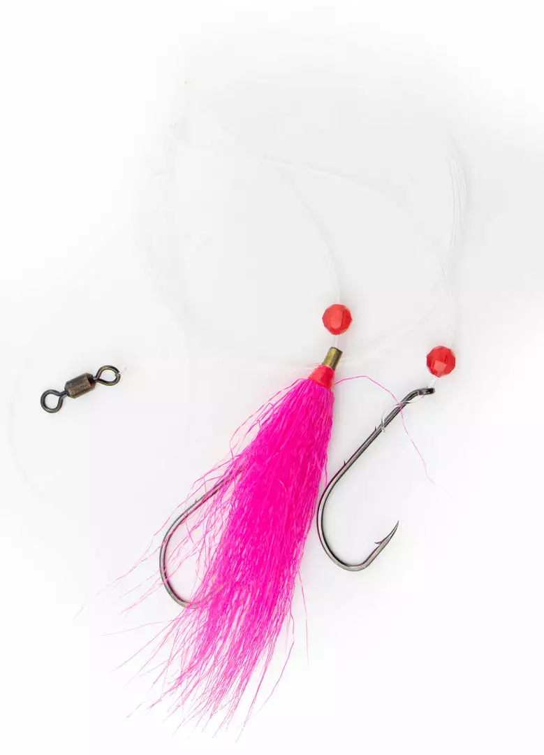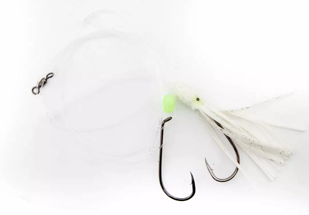 Nobody beats the quality of our custom rigs, hand tied right here by professional fishermen, with the right configuration to catch your target species. These Hi-Lo “chicken rigs” are meant for sea bass, porgies, cod, and many other bottom fishing species. These rigs have a sinker loop at the bottom, one low hook, and one high hook, with a swivel at the top. We offer these with various bead/teaser configurations. Fish these rigs with clams, sandworms, or squid.