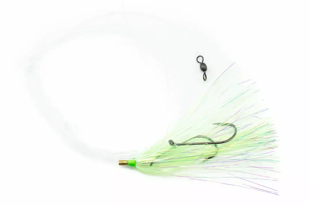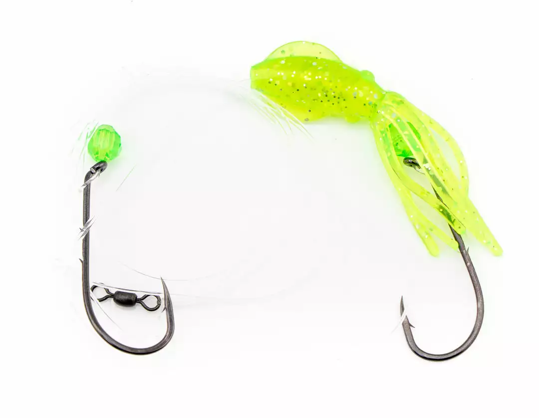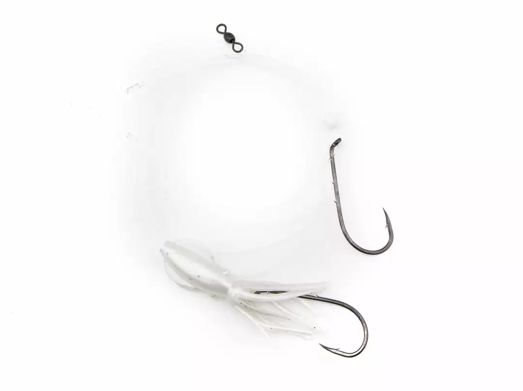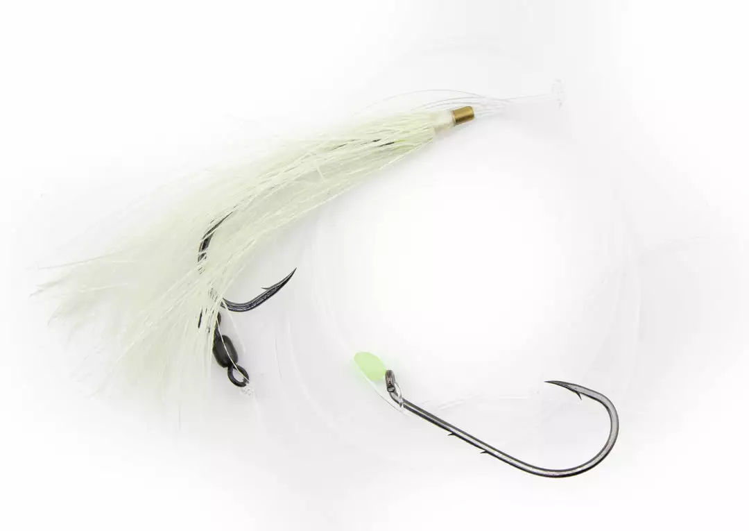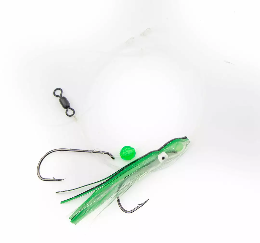 Nobody beats the quality of our custom rigs, hand tied right here by professional fishermen, with the right configuration to catch your target species. These Hi-Lo “chicken rigs” are meant for sea bass, porgies, cod, and many other bottom fishing species. These rigs have a sinker loop at the bottom, one low hook, and one high hook, with a swivel at the top. We offer these with various bead/teaser configurations. Fish these rigs with clams, sandworms, or squid.