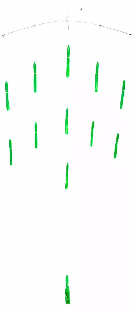 These spreader bars are rigged in a pattern that is meant to give the illusion of a group of squids/baitfish moving as a school with an “injured” bait dropped further back as the hook bait. This bar, featuring 11 inch shell squids is great for attracting larger tunas specifically. When you’re seeking out bigeyes, and large bluefins & yellowfins, this is the right bar to put out. This particular bar works well in any position in the spread, but our favorite spot for it is on the short rigger.